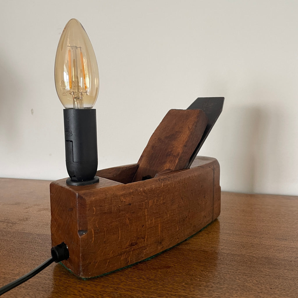 Experience a unique blend of practicality and heritage with this distinctive table lamp crafted from an antique carpenter’s wood plane.