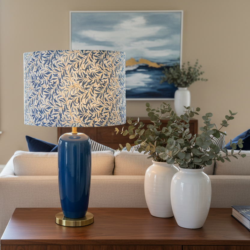 Bring timeless elegance to your home with a handcrafted William Morris Willow Boughs lampshade in beautiful blue tones. This iconic Arts and Crafts design features flowing willow leaves in shades of blue and white, creating a sophisticated botanical pattern that complements both traditional and contemporary interiors.